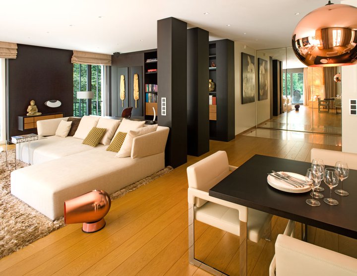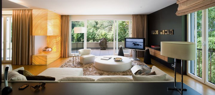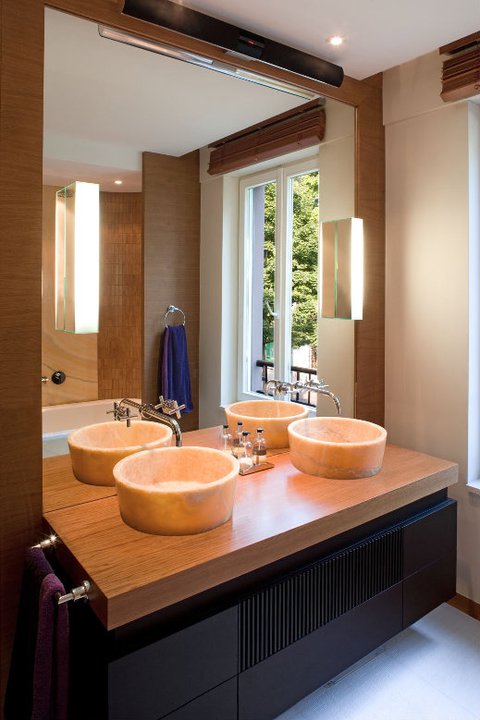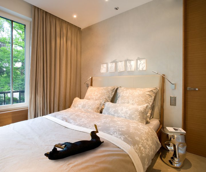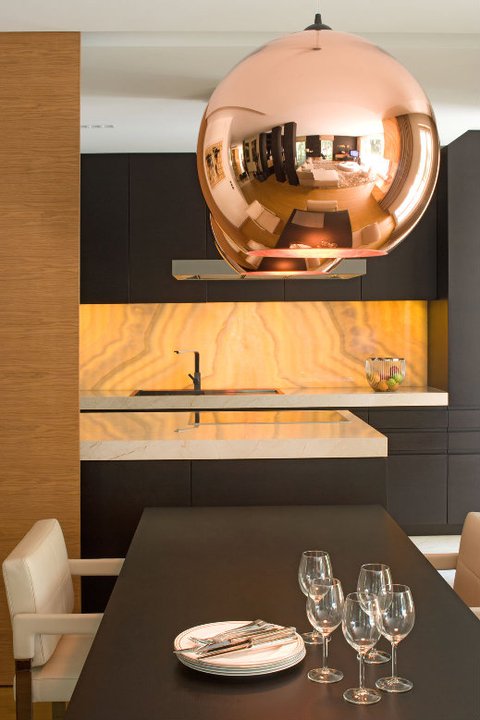Luksusowy apartament w malowniczej części Berlina. Naszym zadaniem było przeprojektowanie rzutu tego wakacyjnego mieszkania dla małżeństwa z dzieckiem. Powstała kameralna strefa głównej sypialni, łazienki i garderoby , pokoju dziecięcego i przestronna część pokoju dziennego z kuchnią, holem, częścią biblioteczną i dużym tarasem z widokiem na piękne stare drzewa. Ciepło podświetlonych alabastrów,miedzianych akcentów i barwionej na kolor koniaku dębowej podłogi uzupełnia ściana zieleni za oknem. Zdjęcia H. Długosz, stylizacja A. Tyślerowicz