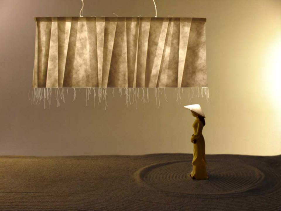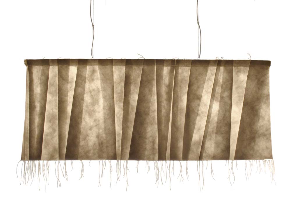 Klosz z plisami z widocznymi szwami i nitkami poetycko filtrującymi światło. Uszyty z białego Tyveku, niejednolicie filtrujący światło. Mocowany do prostokątnej konstrukcji z transparentnego pleksiglasu na rzepy, z łatwością może być wymieniany na nowy o innej stylistyce. Źródło światła to dwie żarówki.