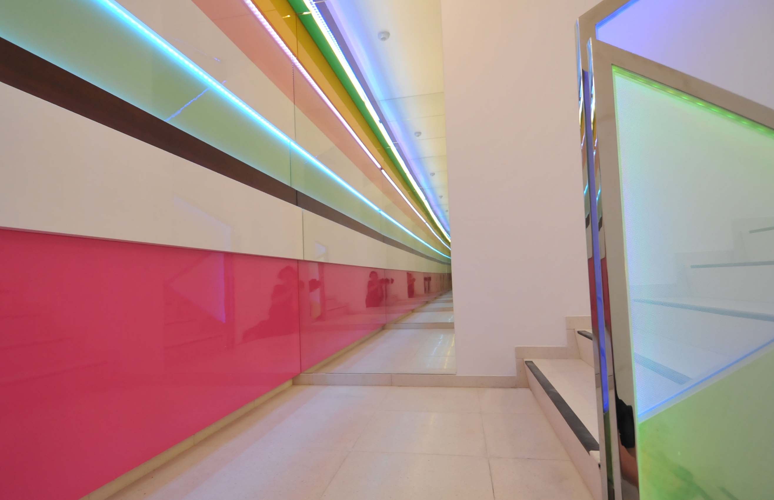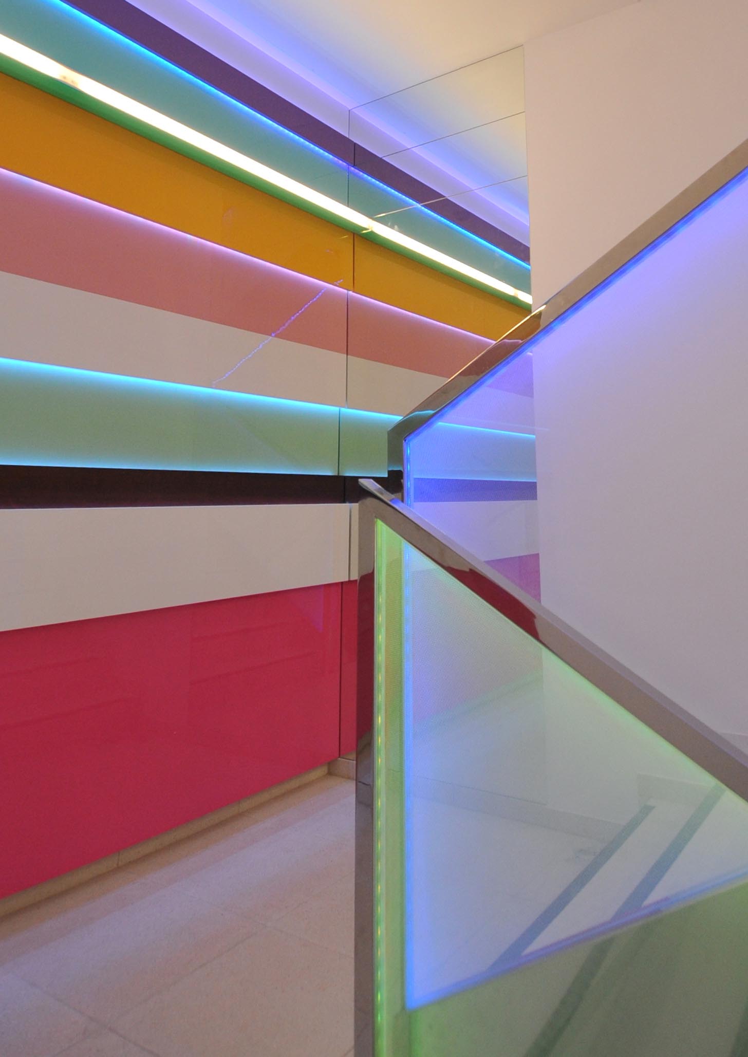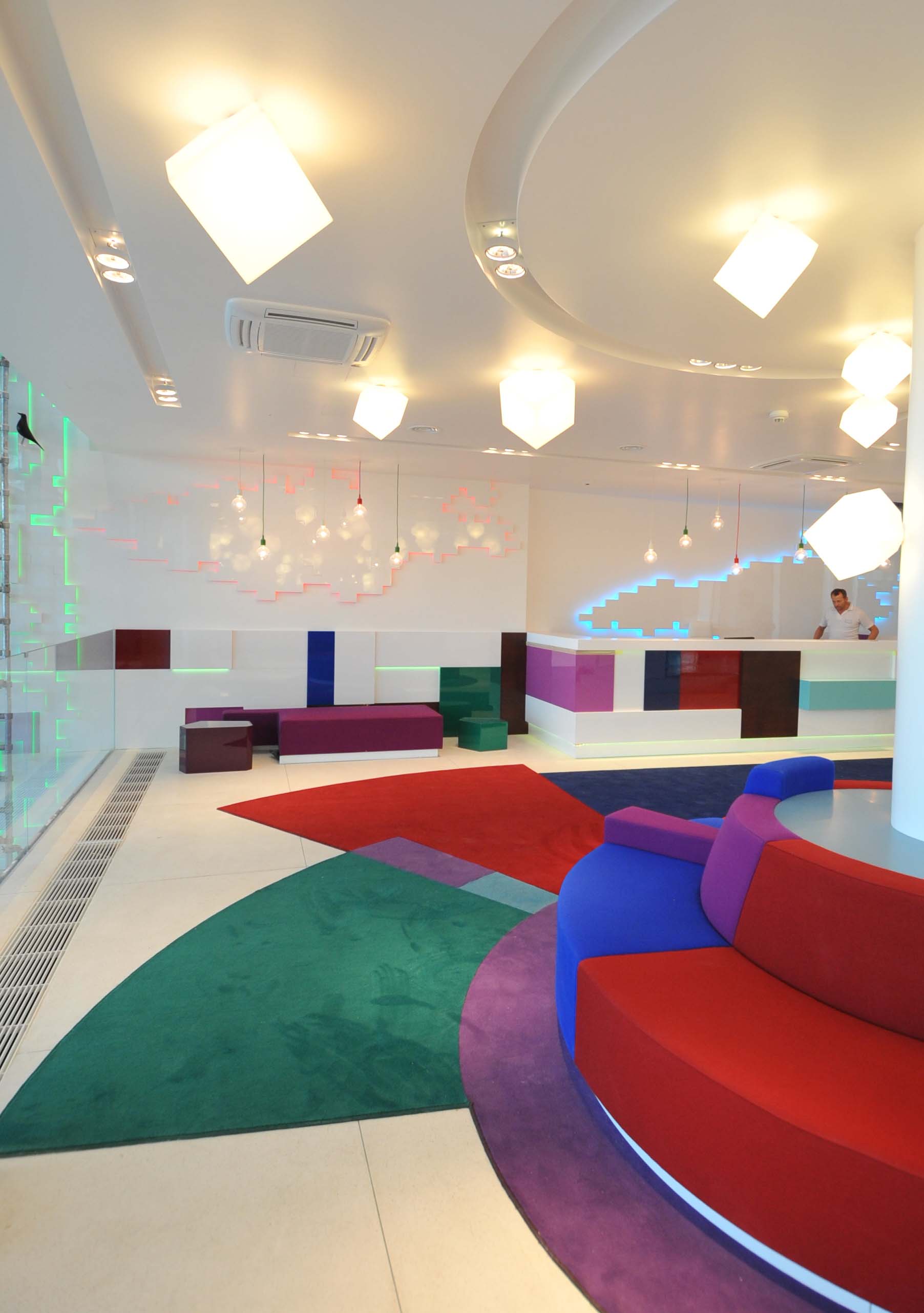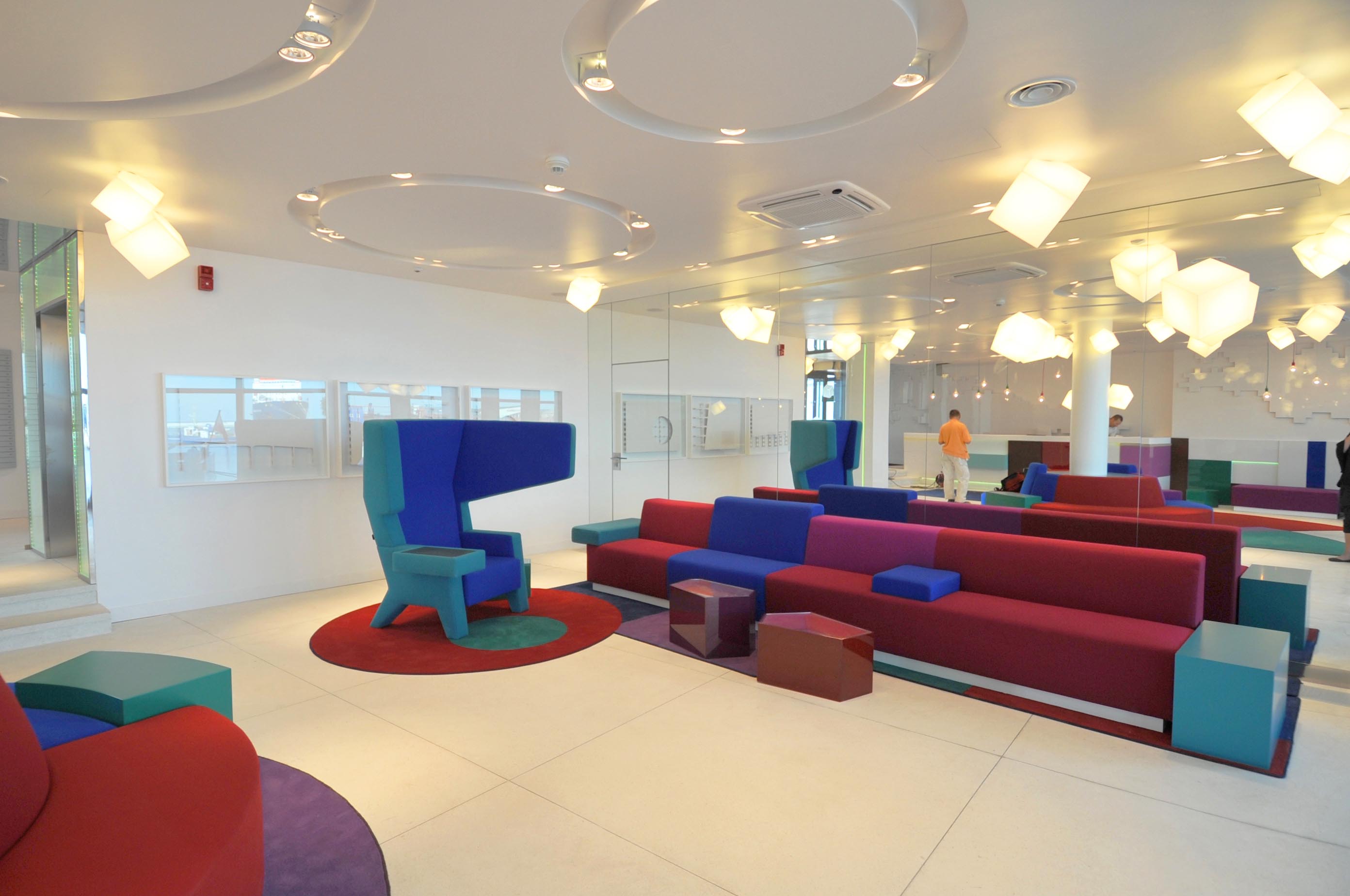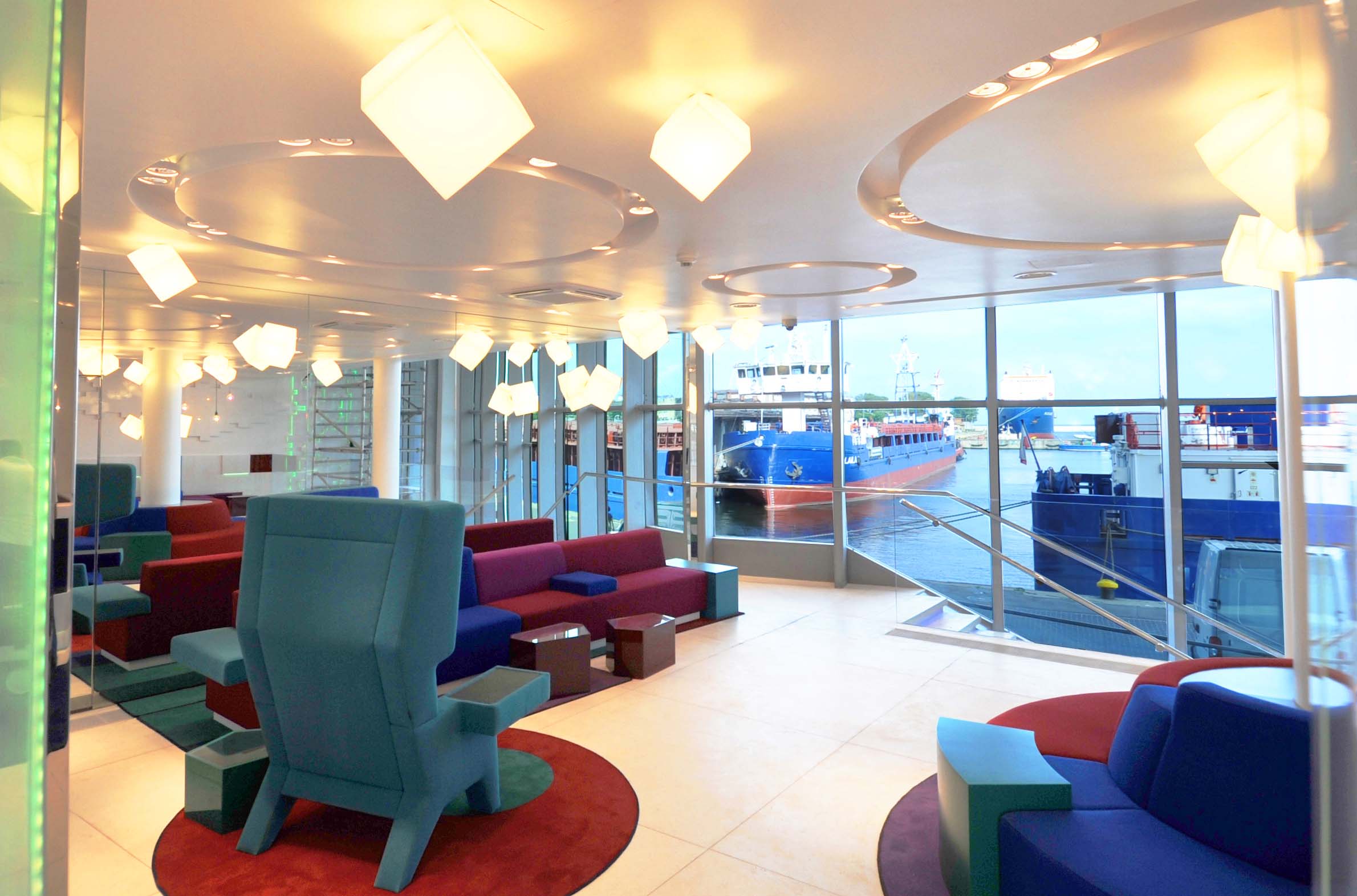 The lobby area with the surreal direct view into the seaport was created as an sculptural form matching to the abstract and colourfull ship forms. Almost all the equipment was custom made. The lobby staged in several movies.