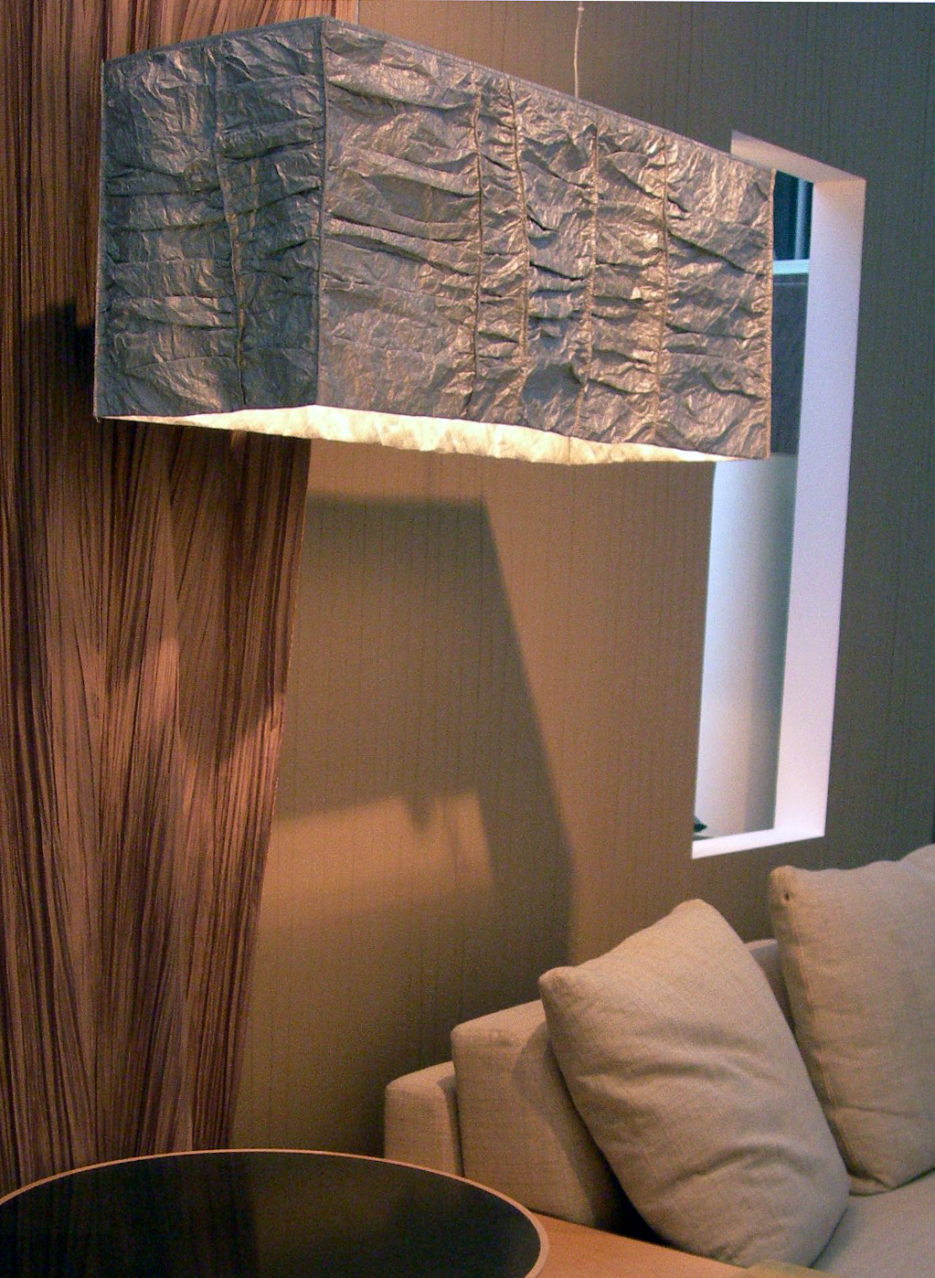Rzeżbiarska lampa z kloszem uszytym z marszczonego srebrnego Tyveku. Odporna na uszkodzenia. Wymyślana w 2001 roku w czasach gdy dominowały techniczne, aluminiowe lampy ze szklanymi kloszami, manifestowała mniej formalne podejście do tematu oświetlenia. Eksplorowała też temat luksusu tworząc bogatą formę z tanich materiałów.