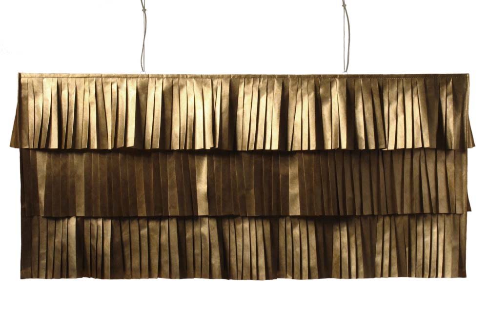 A gold Tyvek lampshade, which transforms the “paper” into a rich, sculptural lampshade with a touch of luxury. White fixture to the ceiling Perspex frame with velcro. Two bulbs.