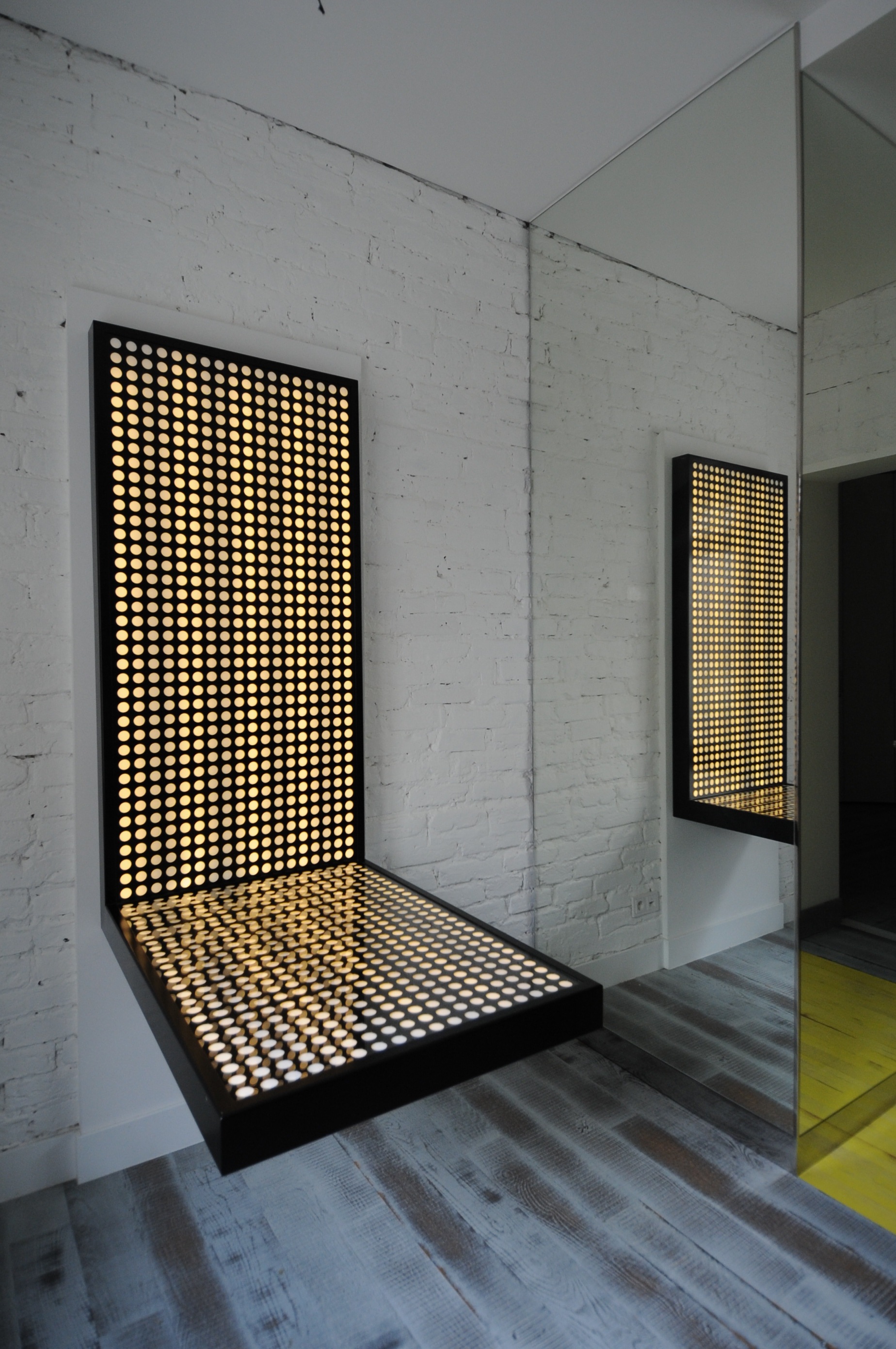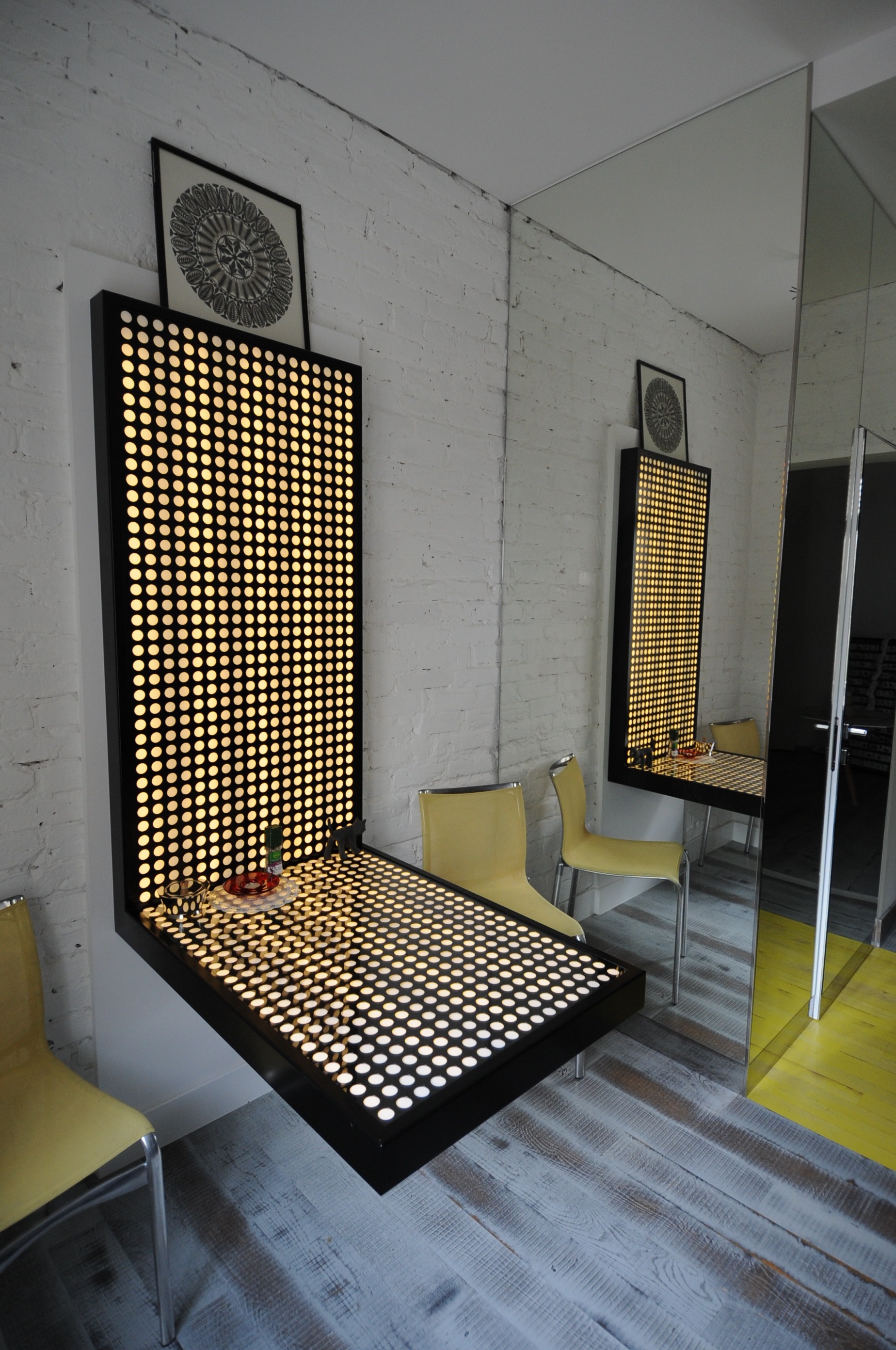 The table – a shining object without legs. Perfect for a small kitchen. Metal supports hidden in the tabletop. LED lighting. An RGB colour changing version available.