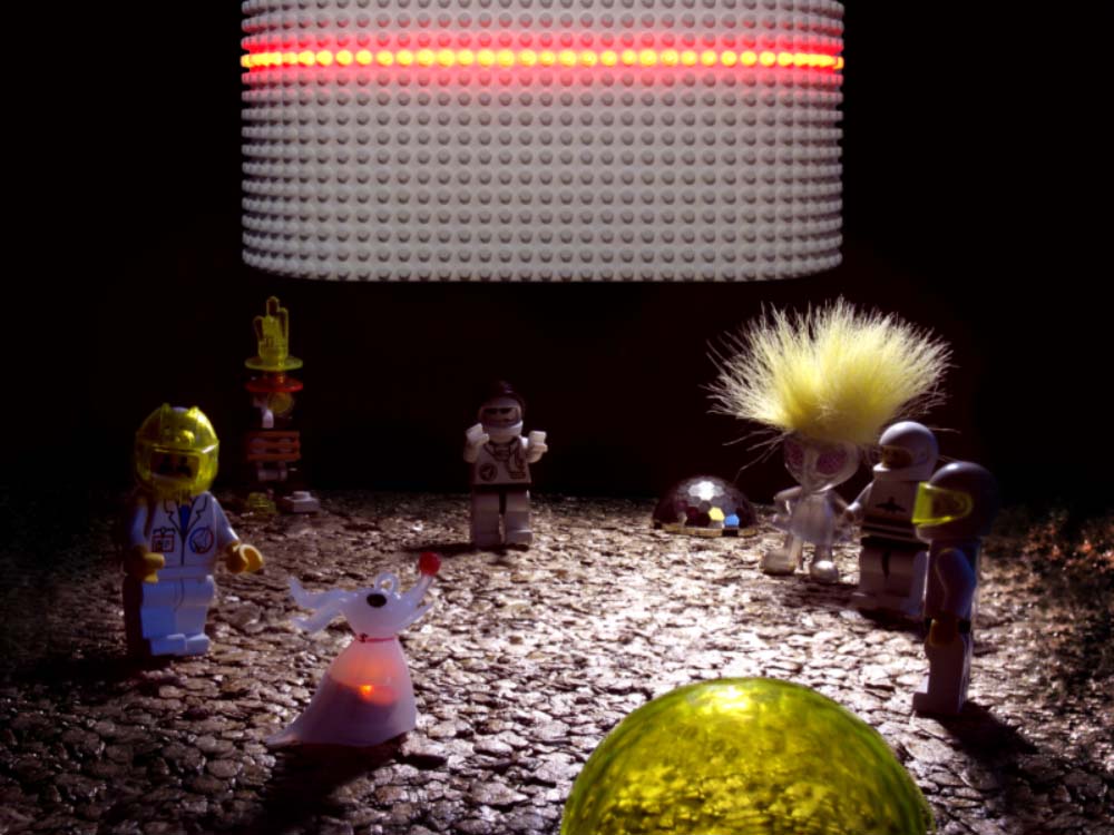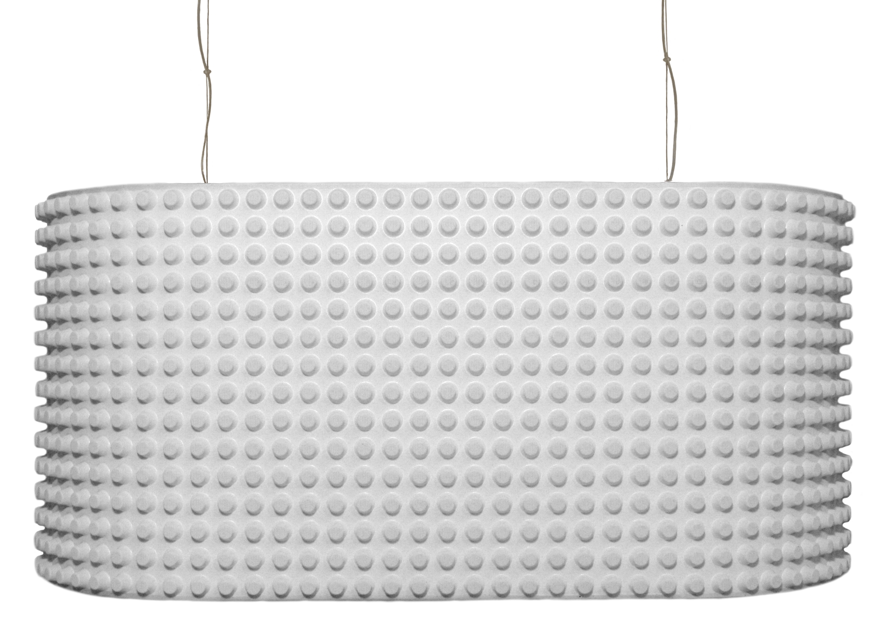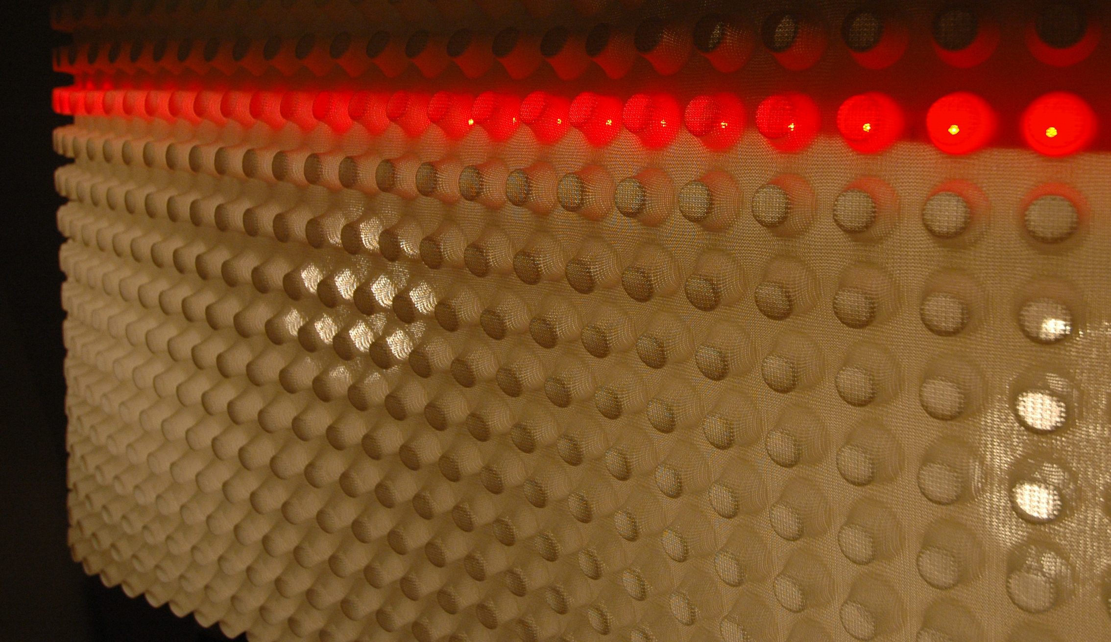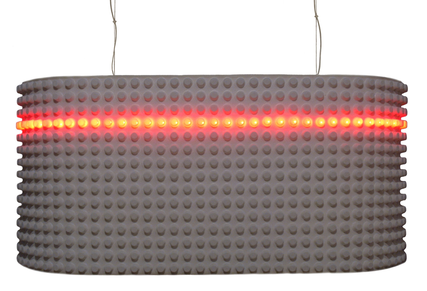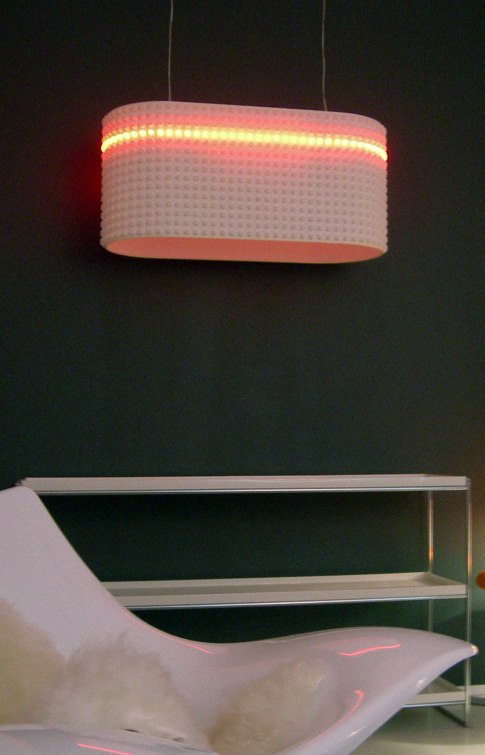 Lampa z dwoma niezależnie zapalanymi źródłami światła : żarówkami dającymi oświetlenie główne oraz paskiem kolorowych diód RGB dopasowanych do rytmu wypukłej tkaniny klosza.