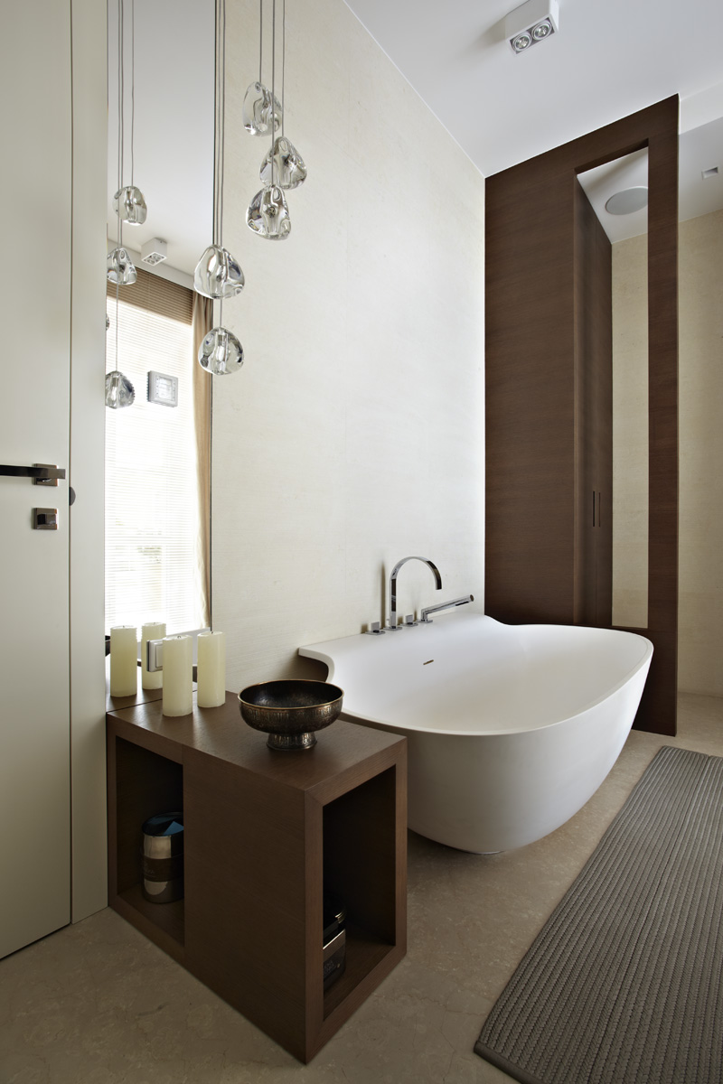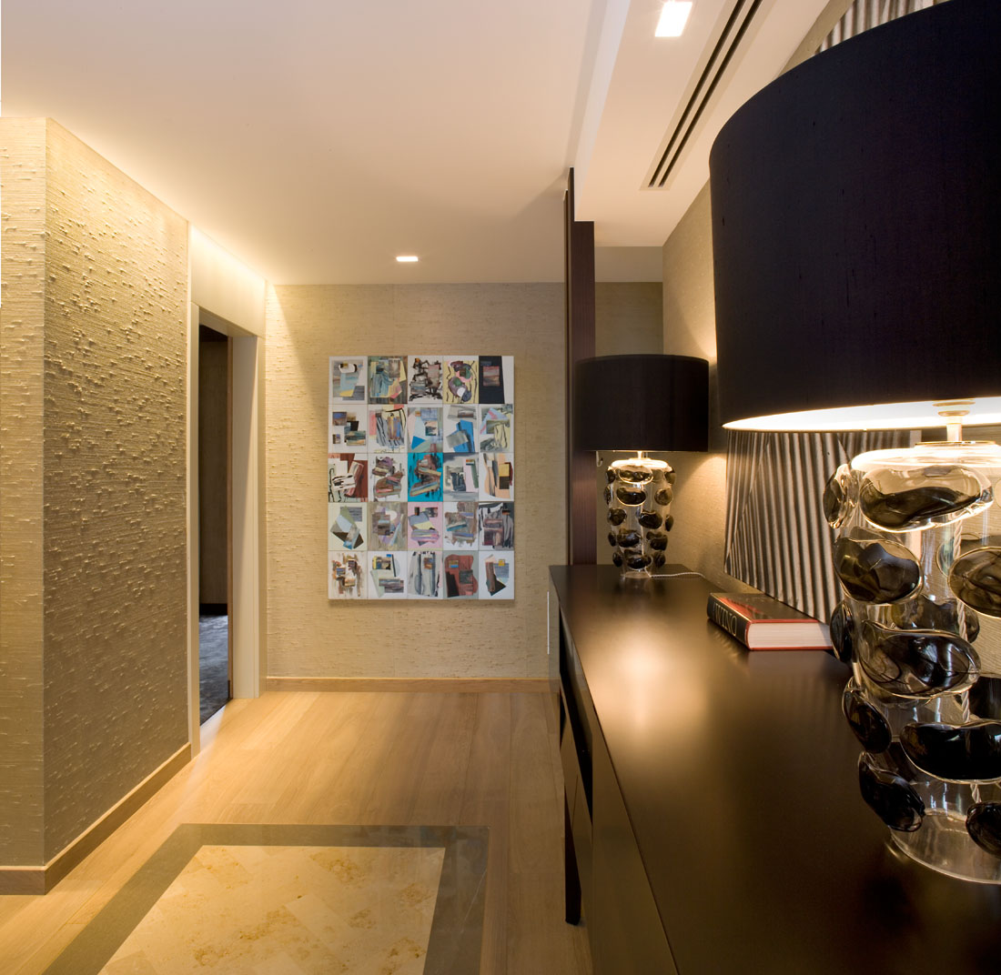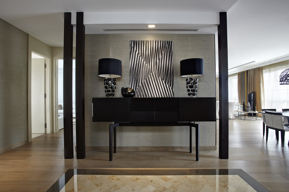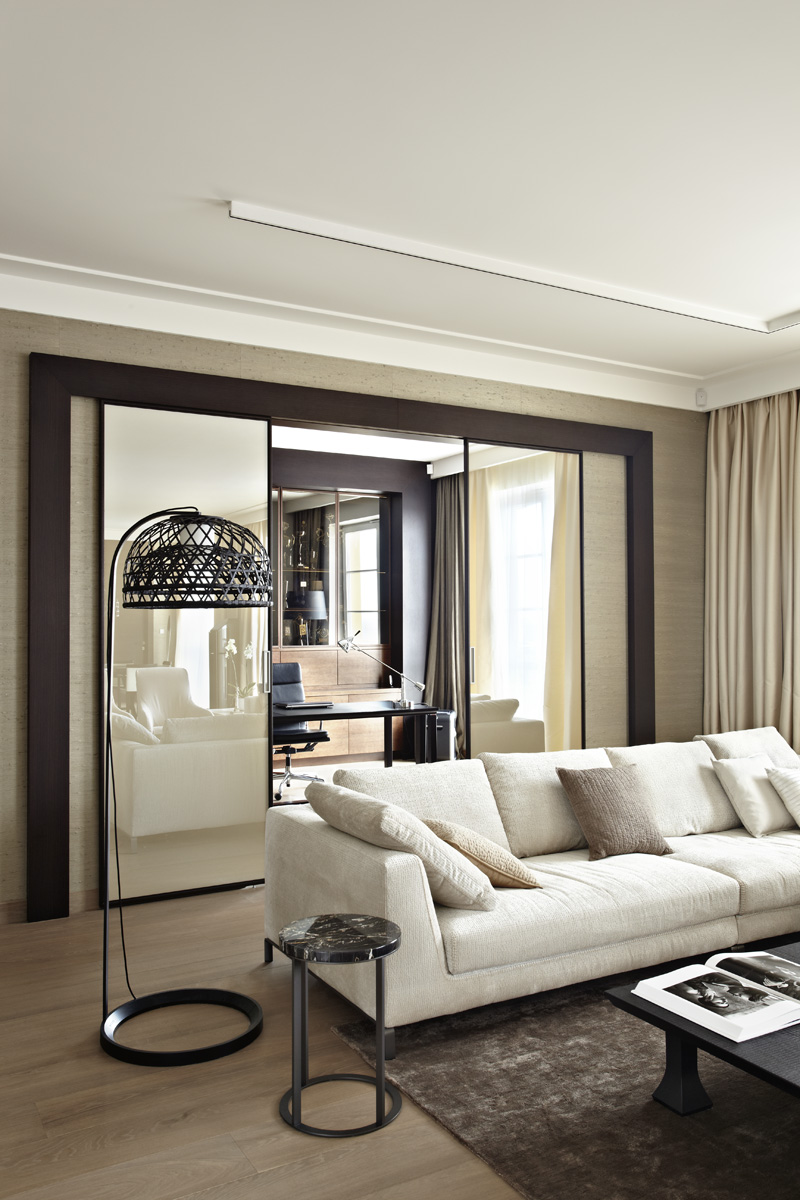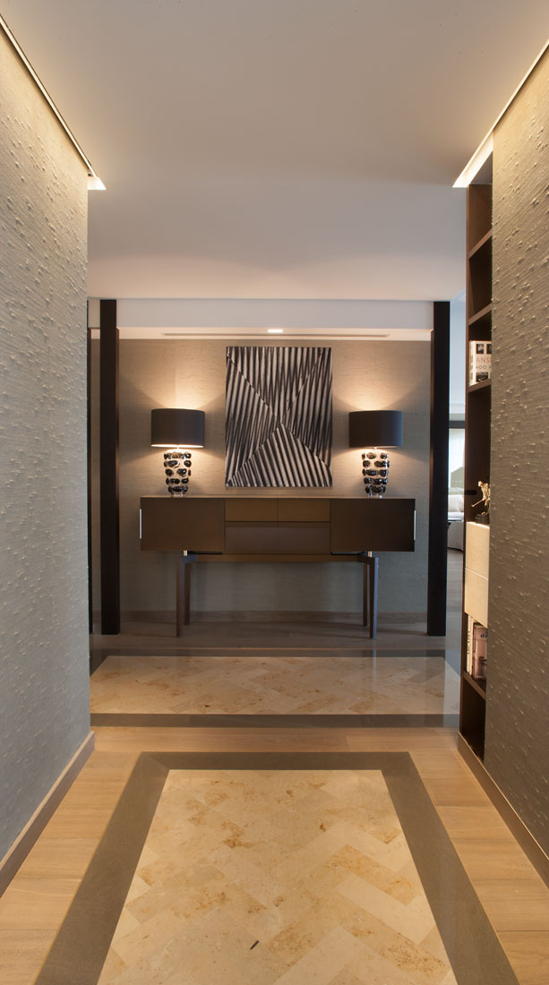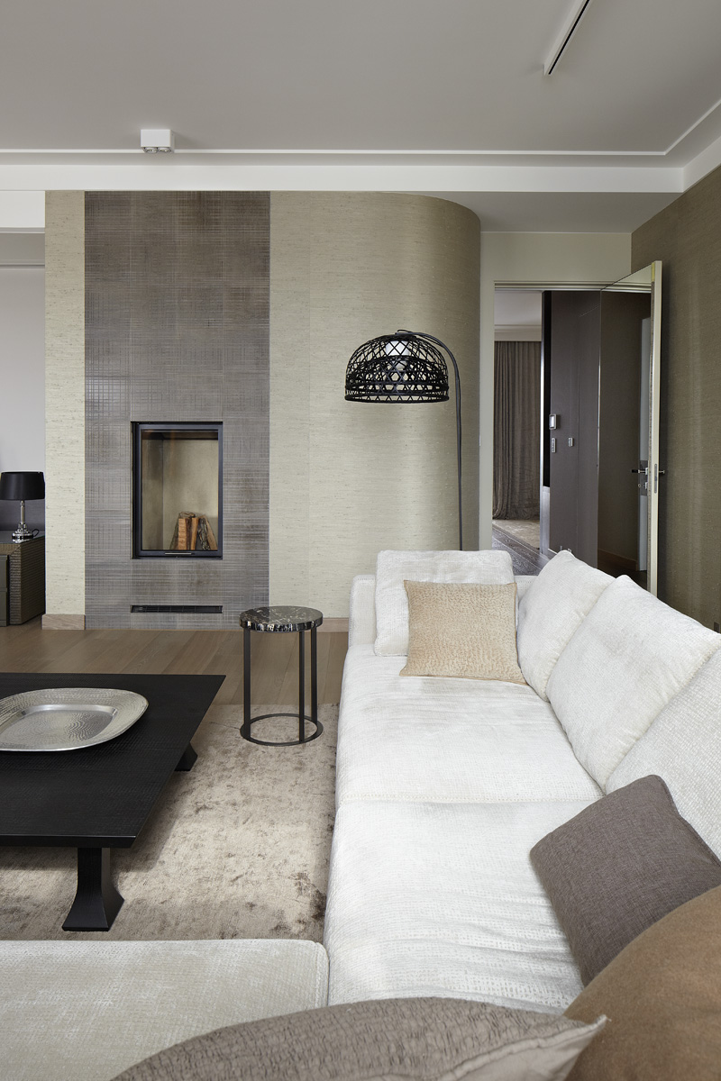An apartment for a businessman, former racing driver. We were asked to design an interior resonating with tranquillity, timeless elegance and basing on a natural set of colours. We implemented minor changes in door alignment and furniture placement, resulting in a balanced and functional plan. Natural colours intwined with natural materials. Sandstone with fossils, grass tapestries, mother-of-pearl are complemented with a dyed parquet and custom made furniture. The apartment is fully air conditioned and all installations were designed to minimally interfere with the interior, resulting in a truly comfortable environment.