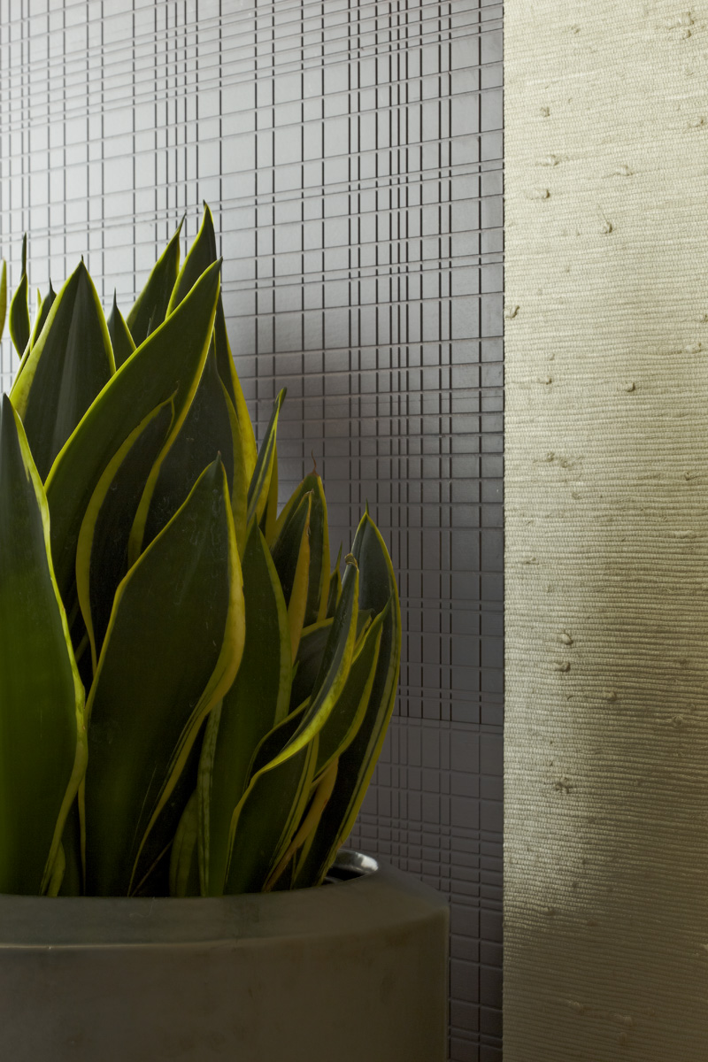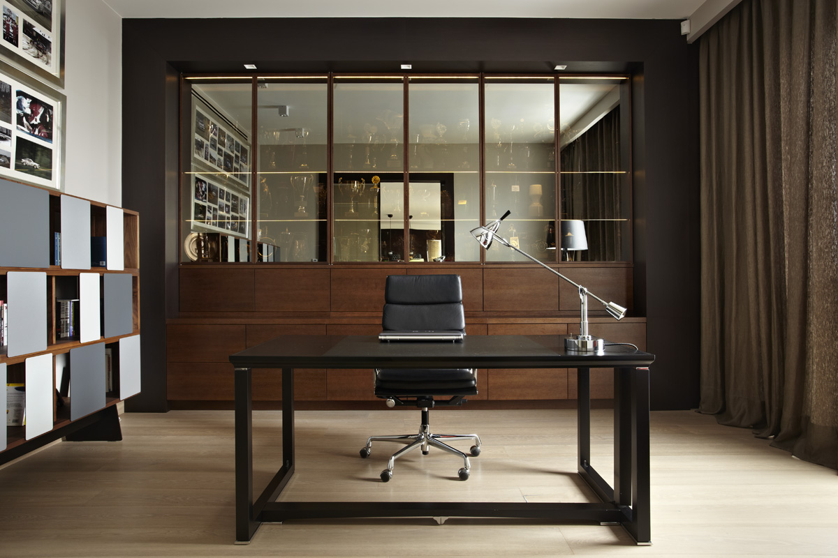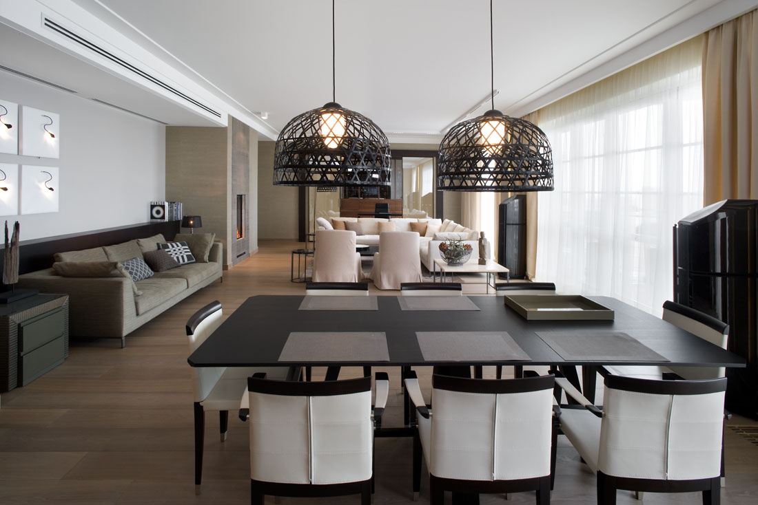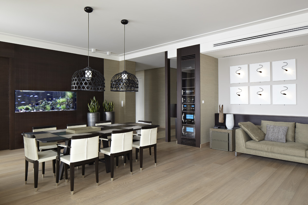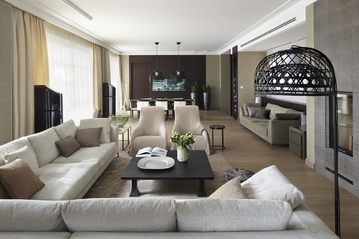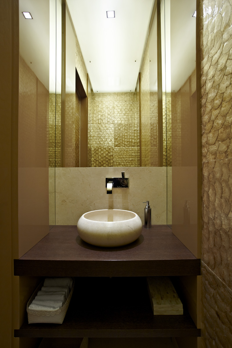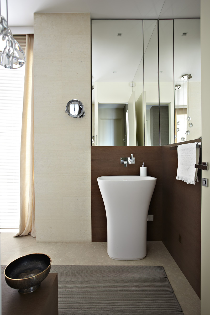 An apartment for a businessman, former racing driver. We were asked to design an interior resonating with tranquillity, timeless elegance and basing on a natural set of colours. We implemented minor changes in door alignment and furniture placement, resulting in a balanced and functional plan. Natural colours intwined with natural materials. Sandstone with fossils, grass tapestries, mother-of-pearl are complemented with a dyed parquet and custom made furniture. The apartment is fully air conditioned and all installations were designed to minimally interfere with the interior, resulting in a truly comfortable environment.