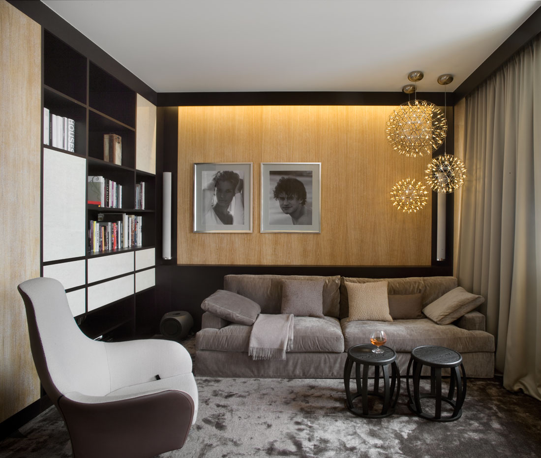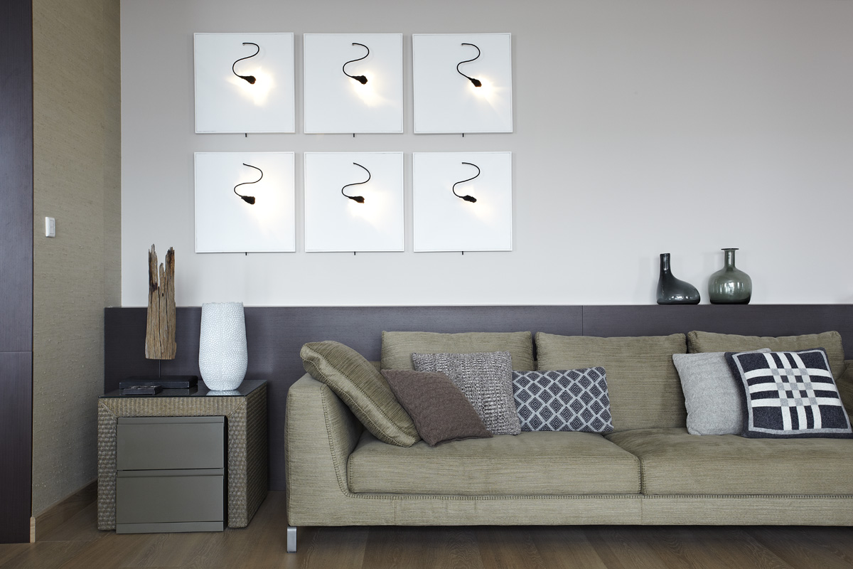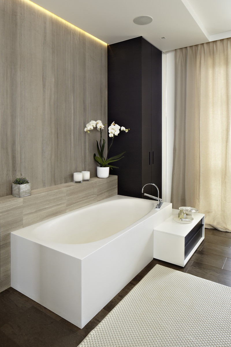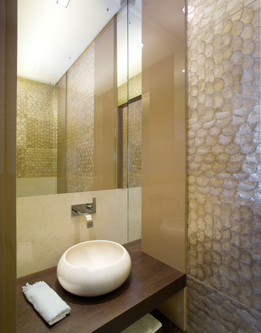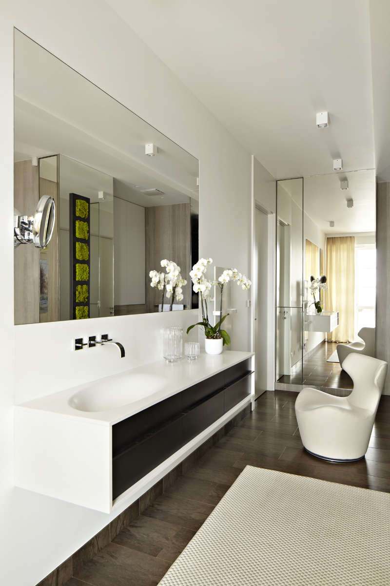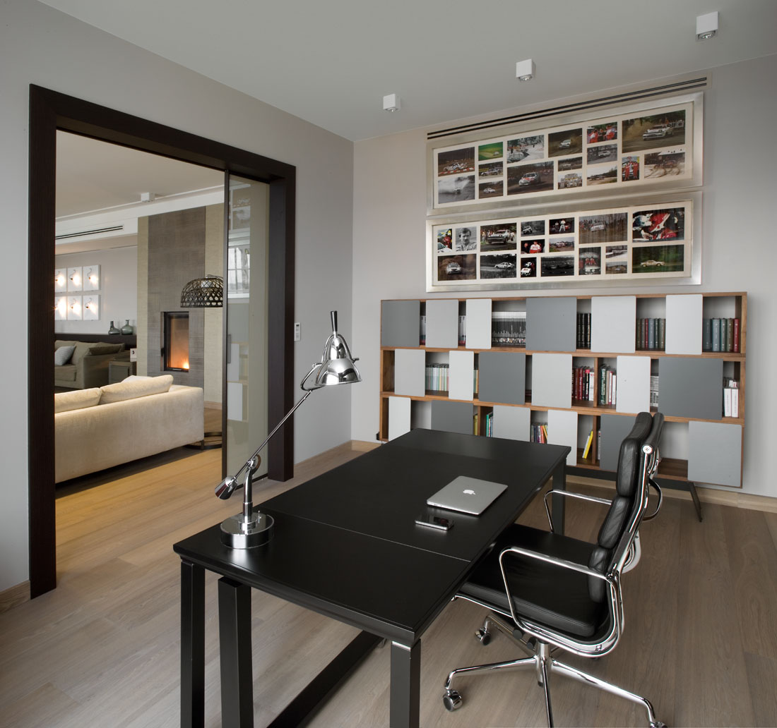An apartment for a businessman, former racing driver. We were asked to design an interior resonating with tranquillity, timeless elegance and basing on a natural set of colours. We implemented minor changes in door alignment and furniture placement, resulting in a balanced and functional plan. Natural colours intwined with natural materials. Sandstone with fossils, grass tapestries, mother-of-pearl are complemented with a dyed parquet and custom made furniture. The apartment is fully air conditioned and all installations were designed to minimally interfere with the interior, resulting in a truly comfortable environment.