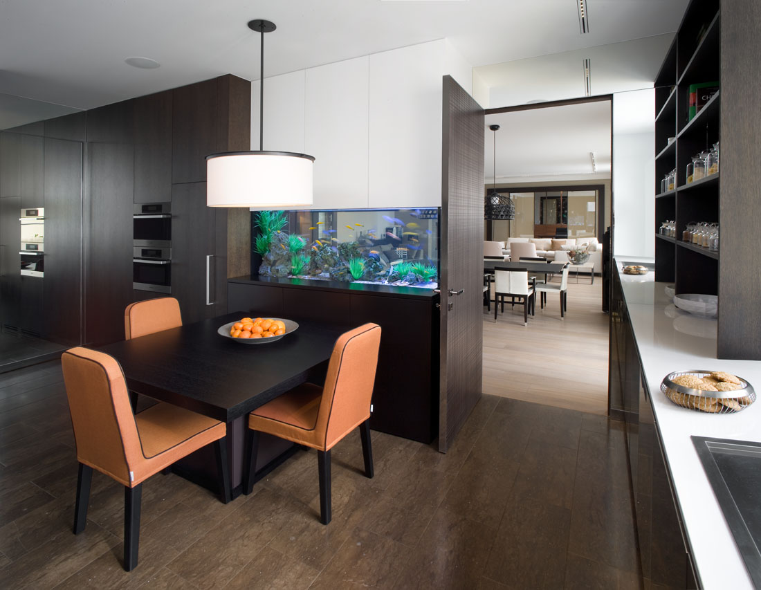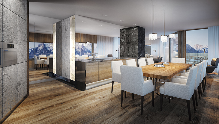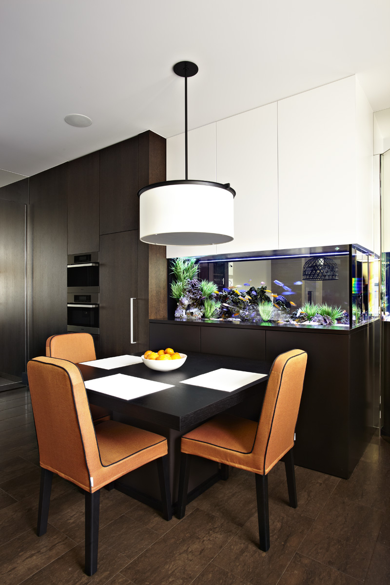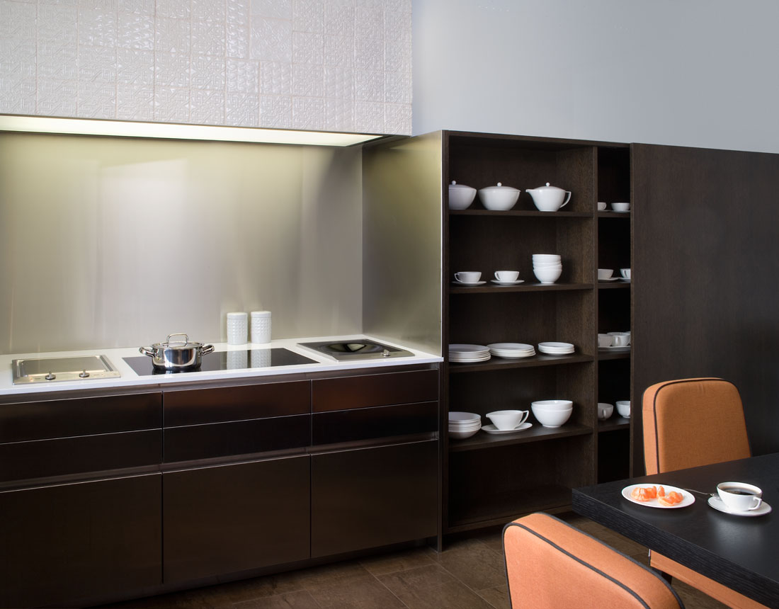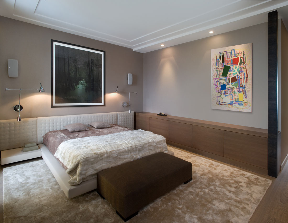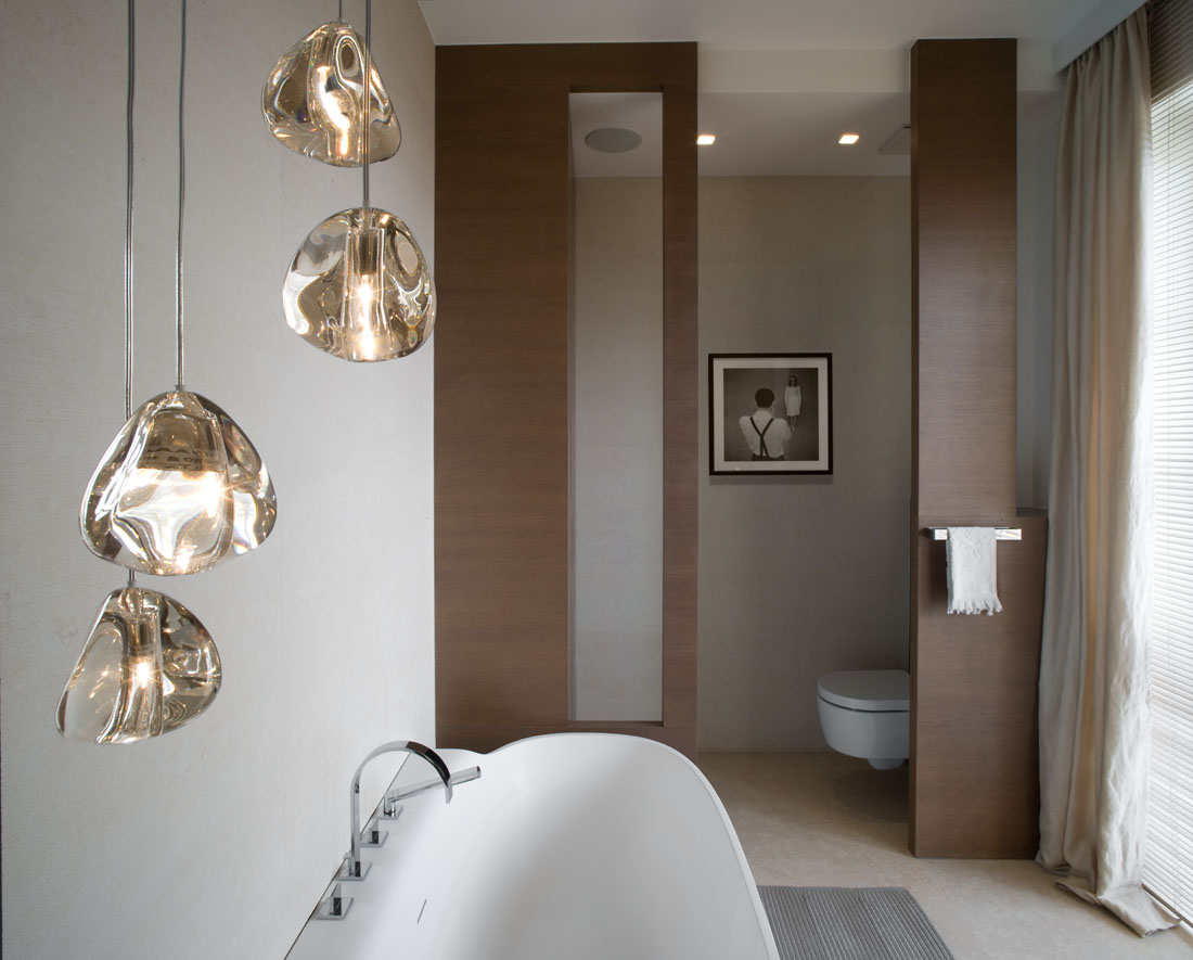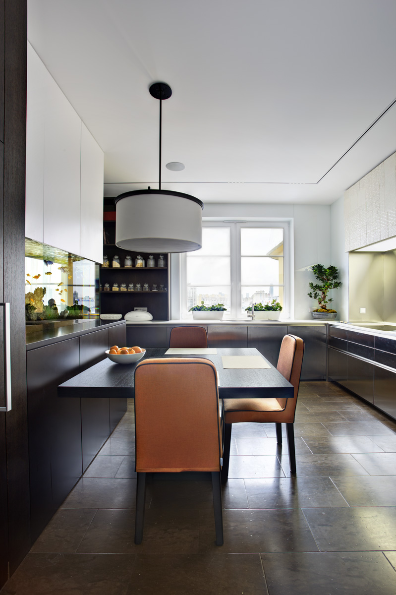 An apartment for a businessman, former racing driver. We were asked to design an interior resonating with tranquillity, timeless elegance and basing on a natural set of colours. We implemented minor changes in door alignment and furniture placement, resulting in a balanced and functional plan. Natural colours intwined with natural materials. Sandstone with fossils, grass tapestries, mother-of-pearl are complemented with a dyed parquet and custom made furniture. The apartment is fully air conditioned and all installations were designed to minimally interfere with the interior, resulting in a truly comfortable environment.